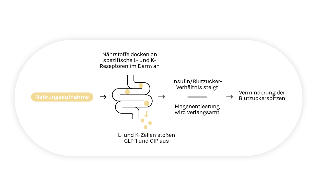 Ein zentraler Akteur im GLYX-System ist das Darmhormon GLP-1 (Glucagon-like Peptide-1). GLP-1 wird immer dann ausgeschüttet, wenn Nahrung in den Darm gelangt. Es stabilisiert den Blutzucker, verlangsamt die Magenentleerung und steigert gleichzeitig das Sättigungsgefühl.
