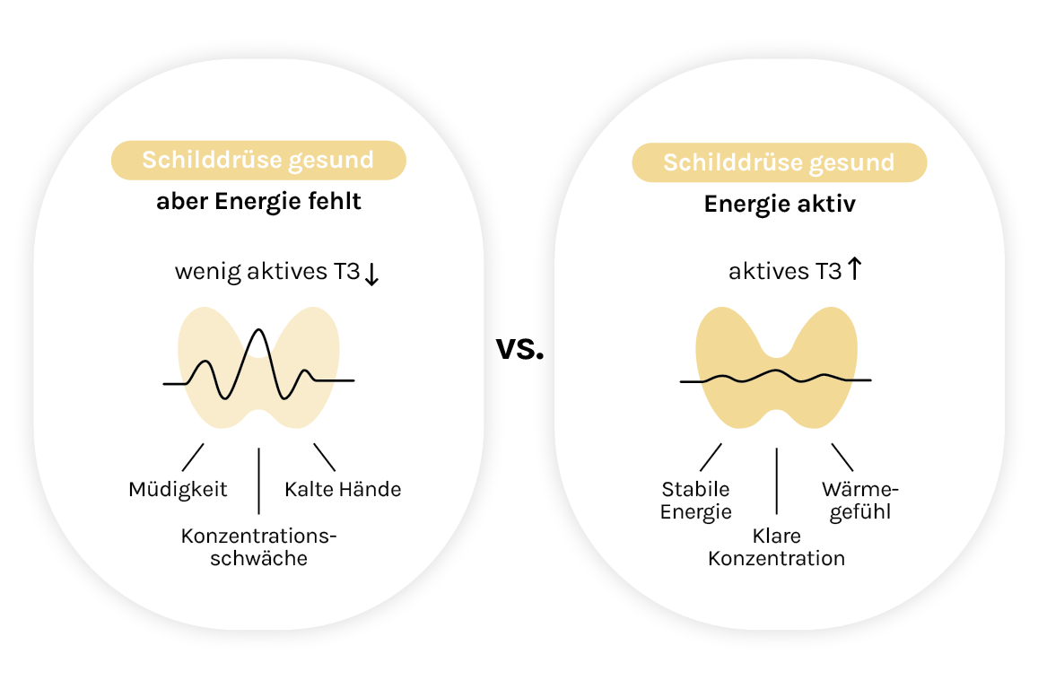 Der Körper reagiert darauf mit Stresssignalen, insbesondere über das Hormon Cortisol. Cortisol blockiert wiederum das Enzym Dejodase Typ 2, das T4 in T3 umwandelt. Das führt zu einem Energiemangel auf Zellebene – obwohl die Schilddrüse selbst völlig gesund sein kann.